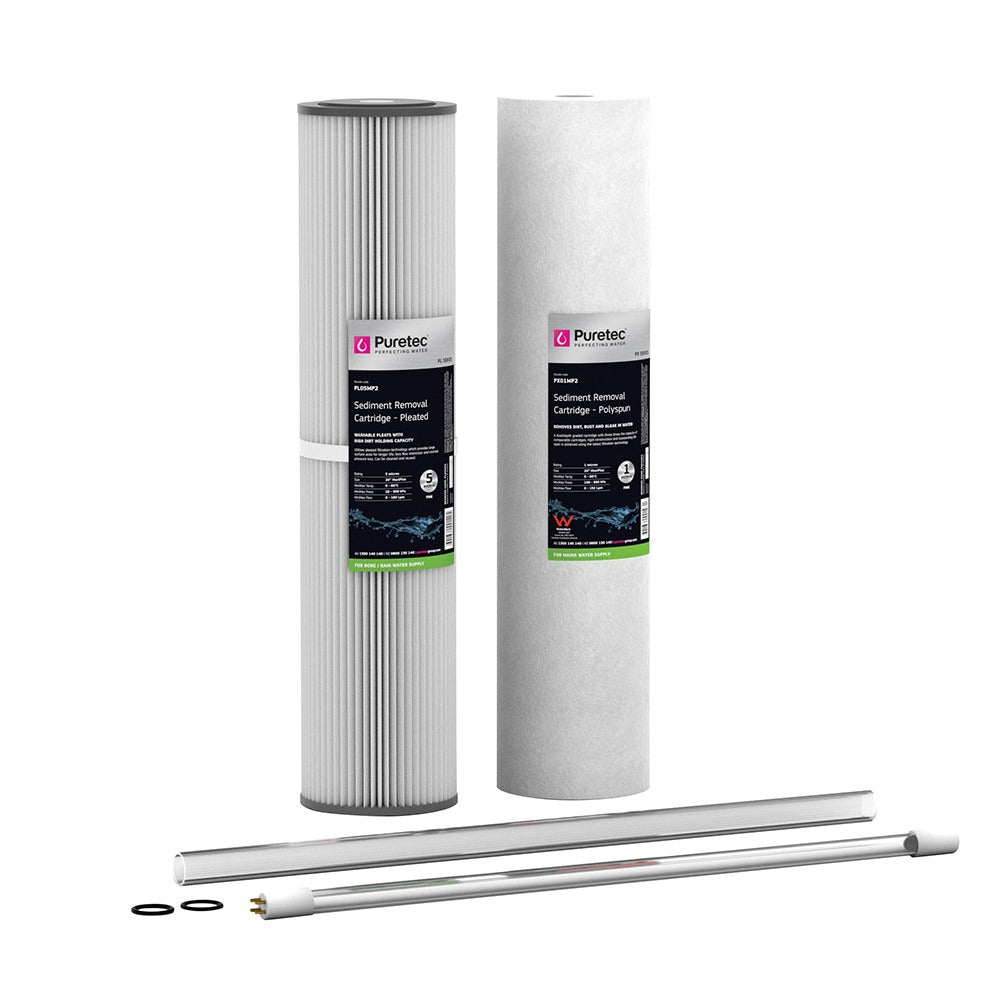 Includes 20" MaxiPlus pleated sediment [PL20MP2] solid polyspun sediment filter [PX01MP2] UV replacement lamp [RL6] replacement quartz sleeve [RQS6] and... Read more